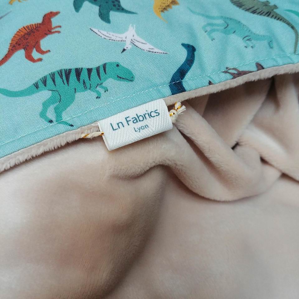 Au final 3 épaisseurs. Un coton imprimé dinosaures dessus, un tissu doudou minky beige dessous, et au milieu une épaisseur de ouate.