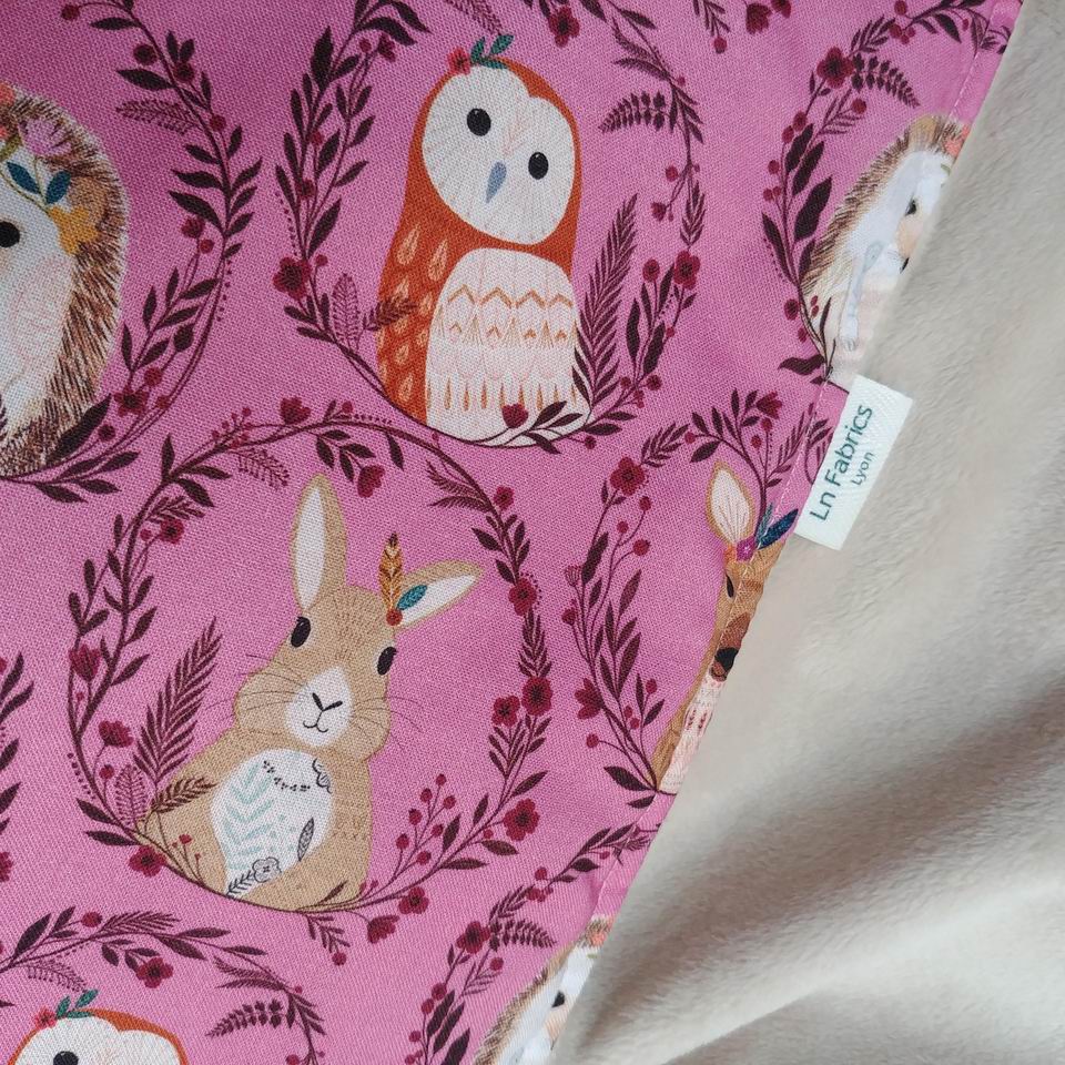 Au final 3 épaisseurs. Un tissu imprimé dans les teintes pastels dessus, un tissu doudou minky beige, et au milieu une épaisseur de ouate chaude et légère.