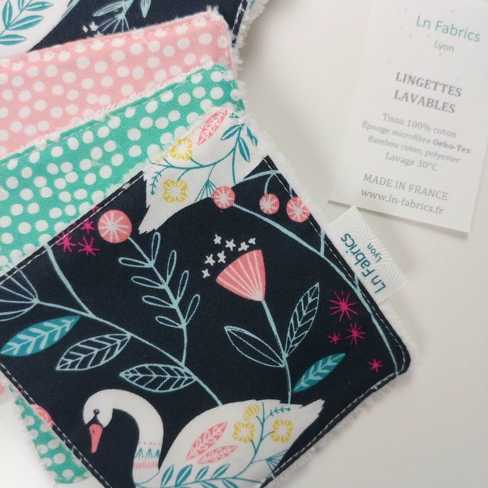 Les tissus utilisés sont de belle qualité. En effet, 1 côté 100% coton imprimé Dashwood Studio avec les cygnes ou les pois, et 1 côté en tissu éponge certifiée Oeko-Tex.