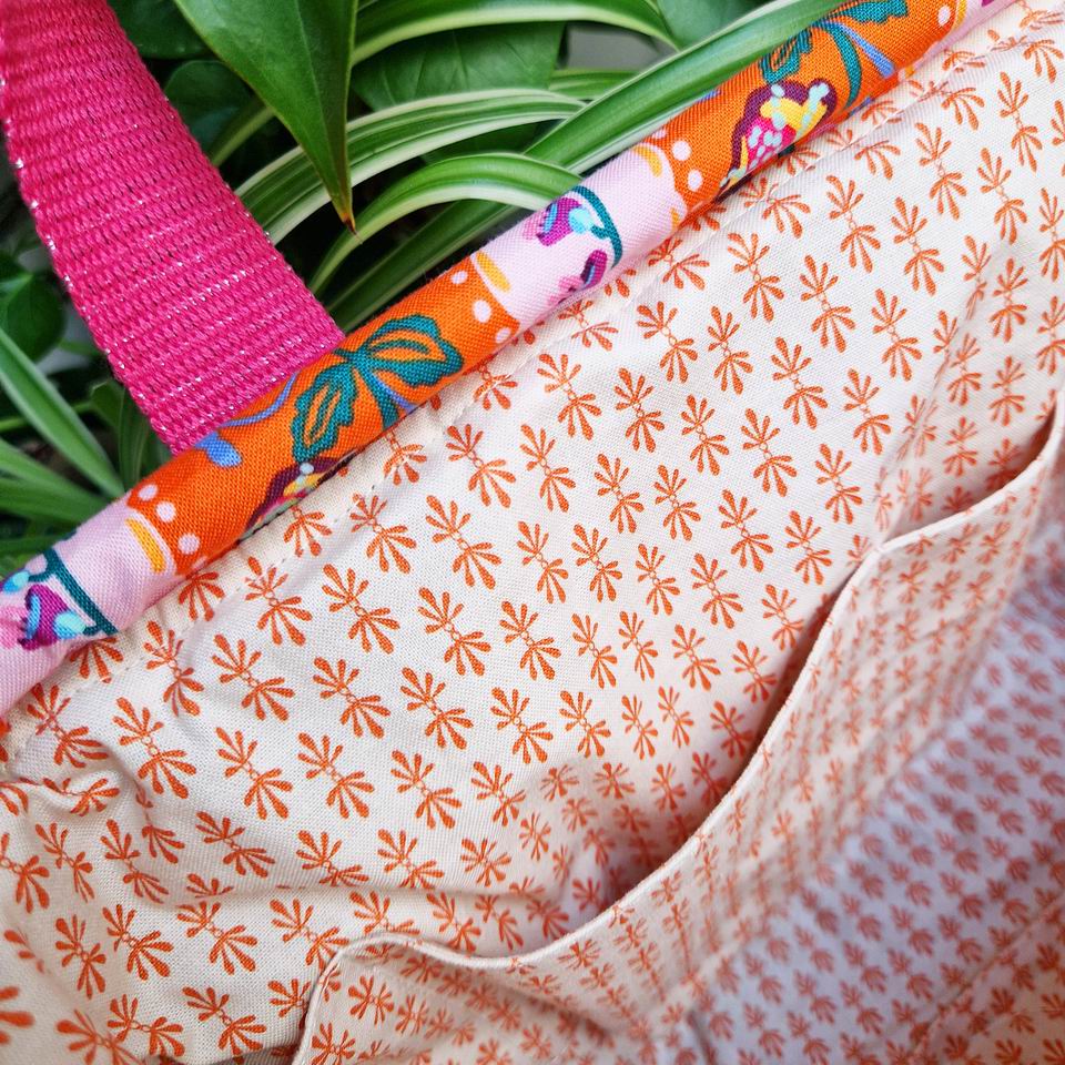 Effectivement, on retrouve l'élégance d'une belle matière naturelle avec la doublure en coton imprimé graphique mini motifs Rifle Paper Co, orange sur fond écru.