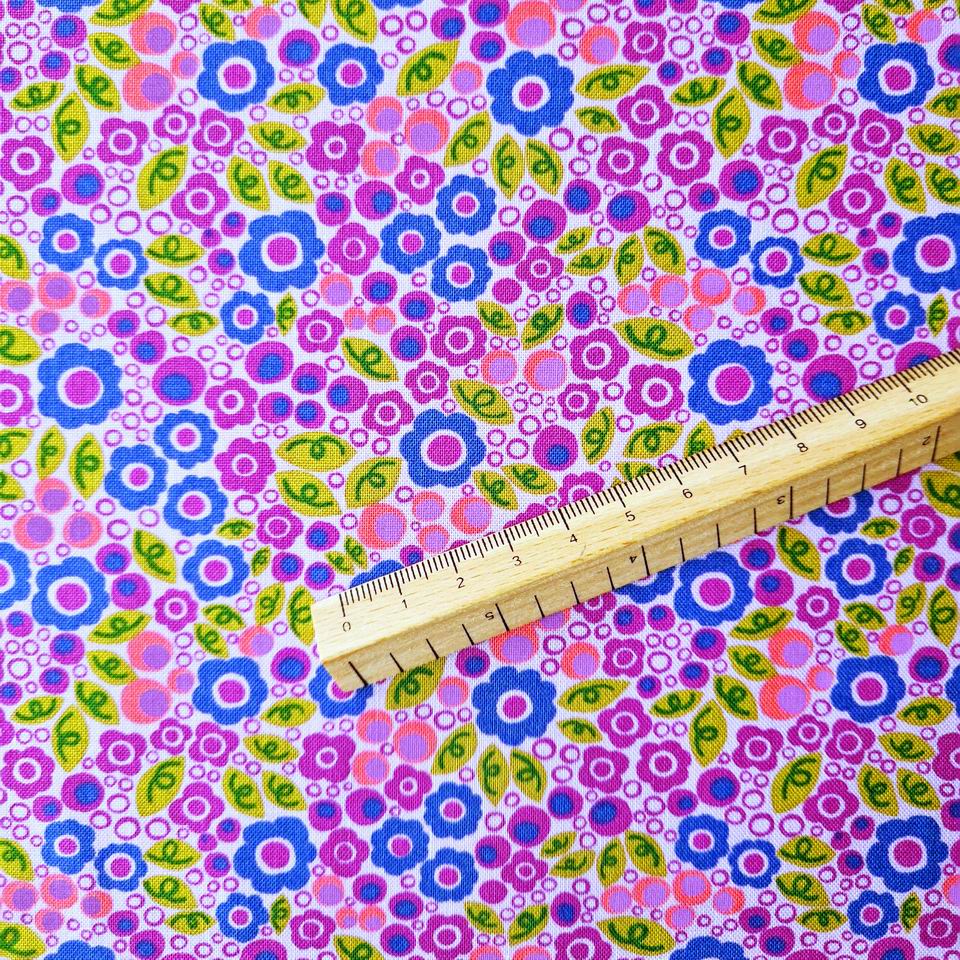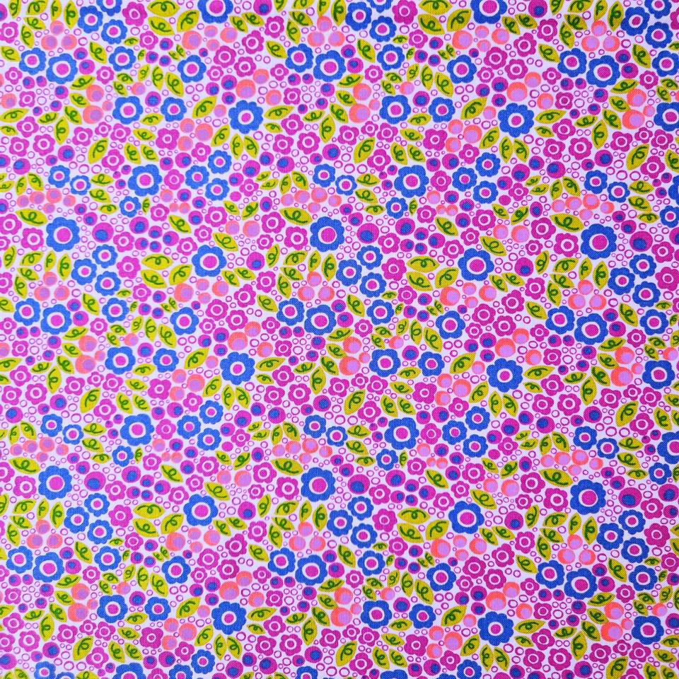 Un coton imprimé très dense avec une abondance de mini fleurs. Une luminosité incroyable pour cet imprimé floral avec ces mini motifs : bleu, violet fuschia, ...