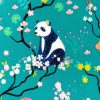 Des animaux magiques et merveilleux se promènent dans ce décor féérique aux branches de cerisier. En effet, sur ce fond lumineux et profond bleu turquoise, on reconnait la silhouette du tigre plein d'assurance rose chamallow à la rayure abricot. Le panda est assis, serein avec sa fleur derrière l'oreille telle la vahiné. Il y a aussi la tortue turquoise à la carapace toute décorée, et la grue gracieuse fragile et délicate en équilibre sur une branche. De petits éclats or métallisé ponctuent ce décor.