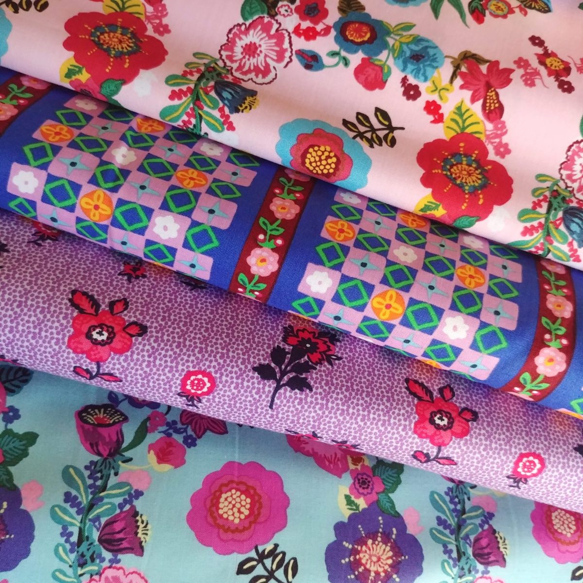 Ce coton imprimé représente des mini motifs géométriques, sur un rythme de rayure, composée d'une mosaïque de petits carrés bleu cobalt, mauve et jaune animés par une guirlande de fleurs. Frais et lumineux à la fois.