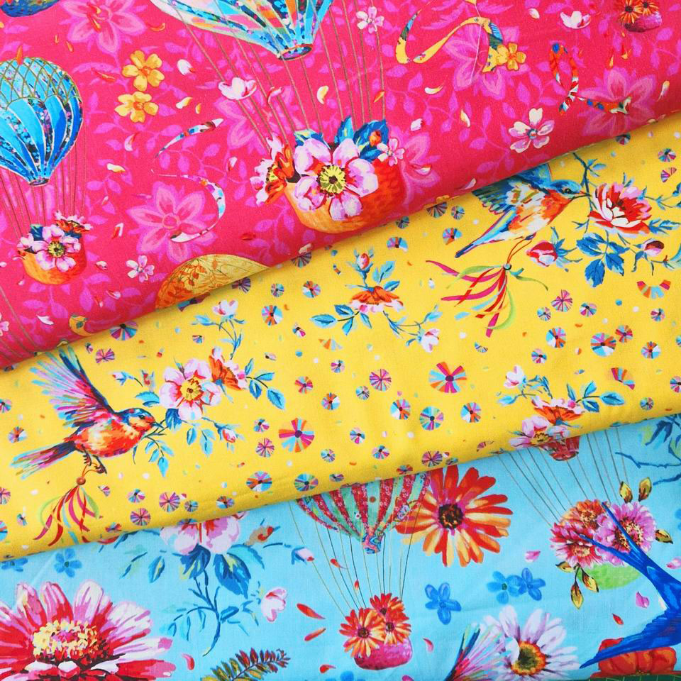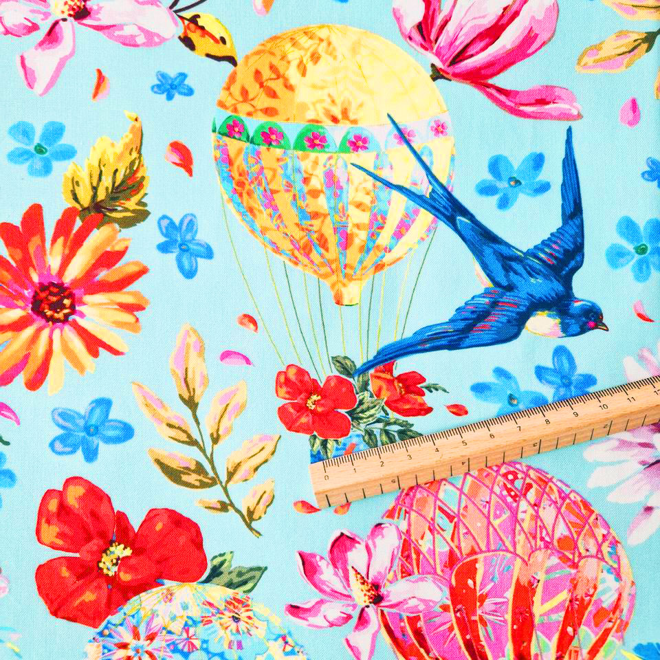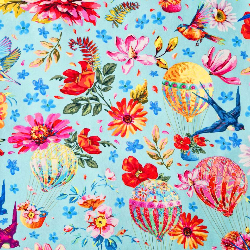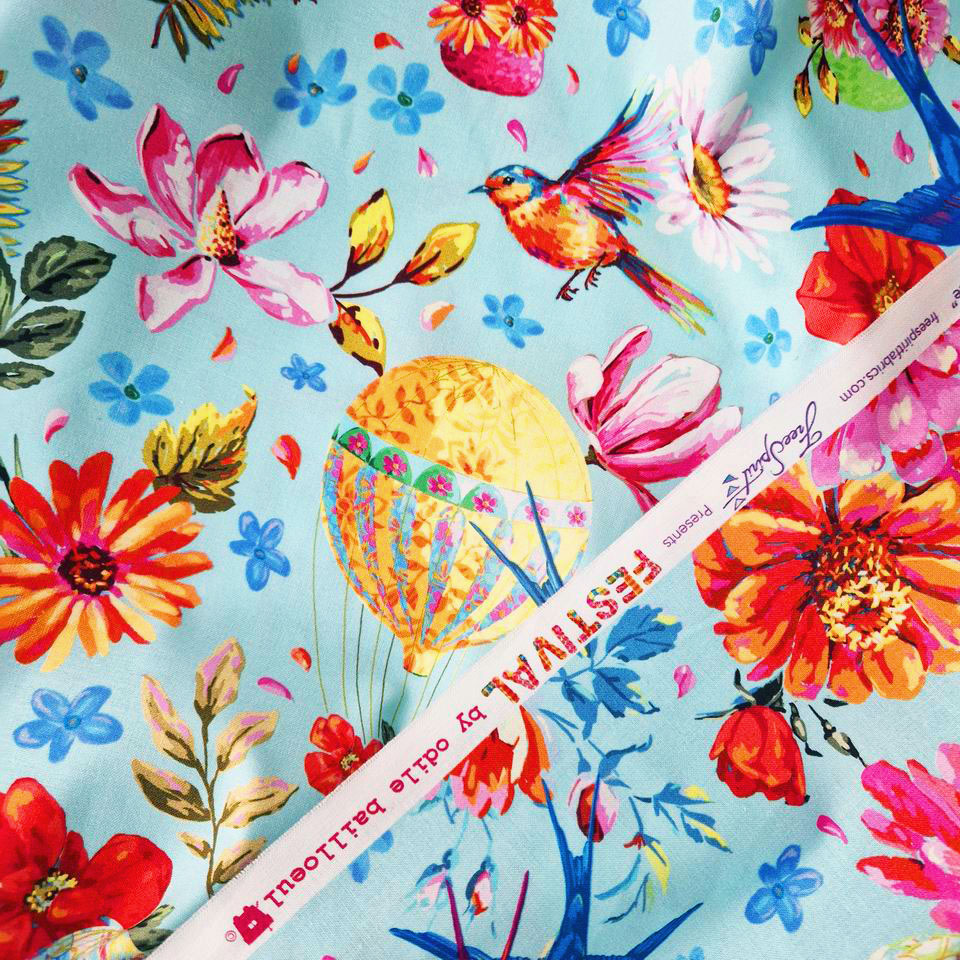 Le tissu intitulé Memory fait donc partie de la collection de motifs imprimés Festival. Ce motif évoque un univers joyeux, coloré, et poétique à la fois. En effet, des oiseaux en plein vol, des ballons fleuris, des fleurs , sur un fond bleu ciel ! Des couleurs intenses, vives et joyeuses !