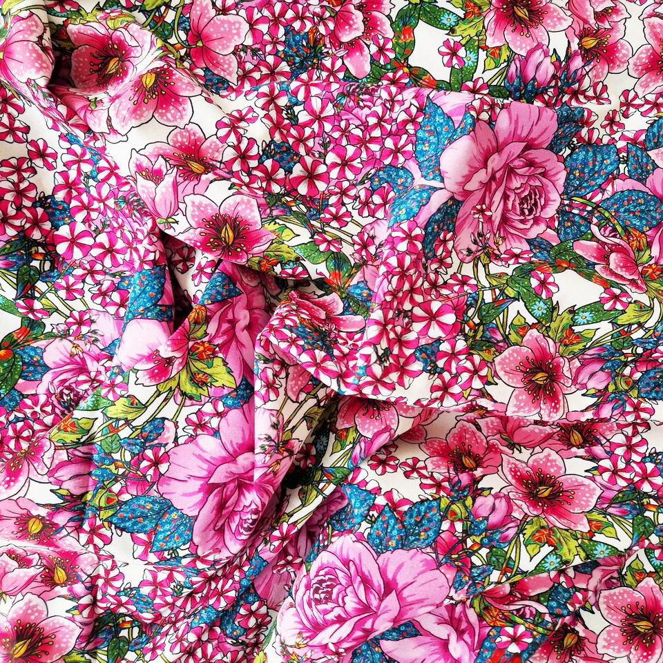 Le tissu intitulé "Sous La Pergola" fait donc partie de la collection d'imprimés Le Langage des Fleurs. Une profusion et une abondance de fleurs rouges et roses, ponctuée d'éclats de blanc, on devine à peine le ciel bleu !