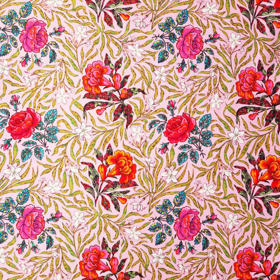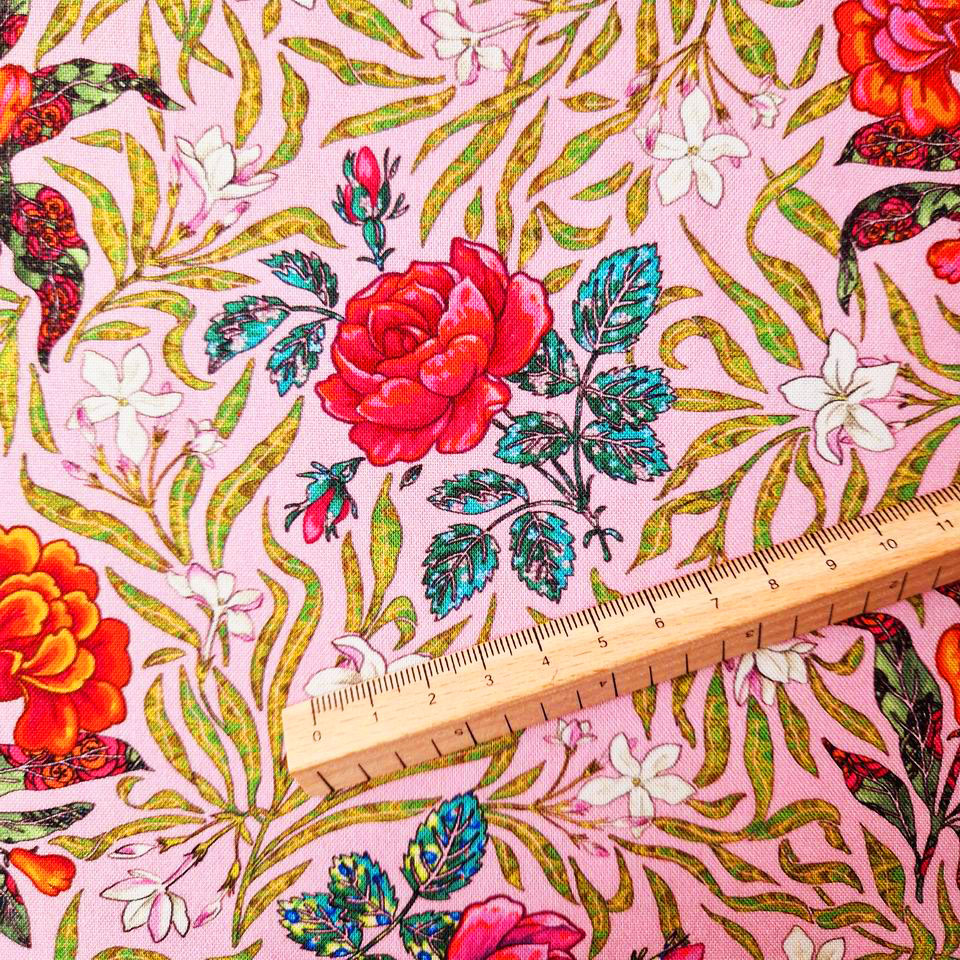 Le tissu intitulé Victorian Rose fait donc partie de la collection d'imprimés Le Langage des Fleurs. Ce motif évoque un univers poétique, délicat avec ce je ne sais quoi, ce petit twist sur le plan des colorations. En effet, sur ce fond rose nude des roses aux couleurs vives éclatent dans ce feuillage vert anis.