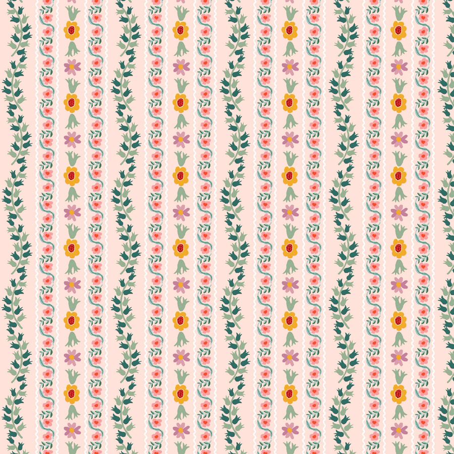 Ce motif textile se compose d'une alternance de rayures de mini fleurs et de feuilles. La palette de couleurs est douce délicate : rose poudré, vert tendre et jaune pale sur ce fond rose nude.