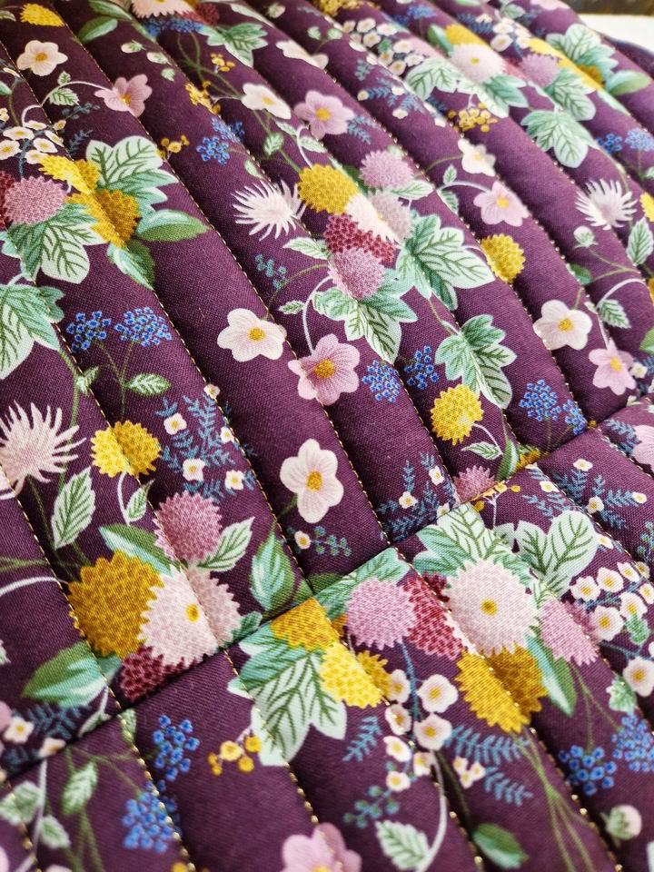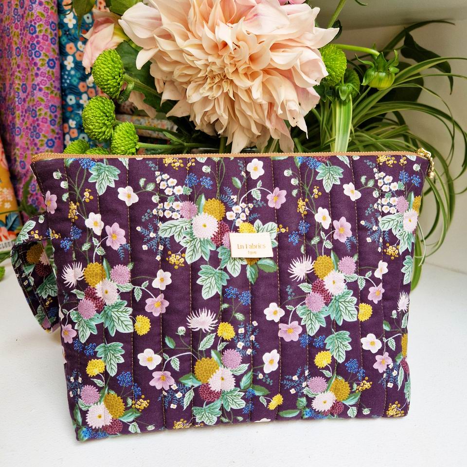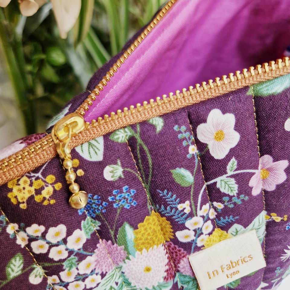 Trousse en tissu matelassé Rifle paper Co, imprimé Dahlia couleur Aubergine ; à l'intérieur, doublure en coton Dashwood Studio couleur Crocus.