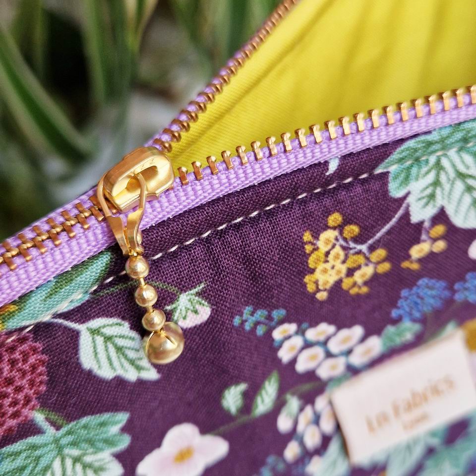 Trousse en tissu Rifle paper Co molletonnée imprimé Dahlia, dans la variante Aubergine ; à l'intérieur, l'élégance d'une jolie matière naturelle, une doublure en coton couleur jaune pickle.