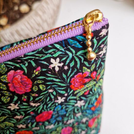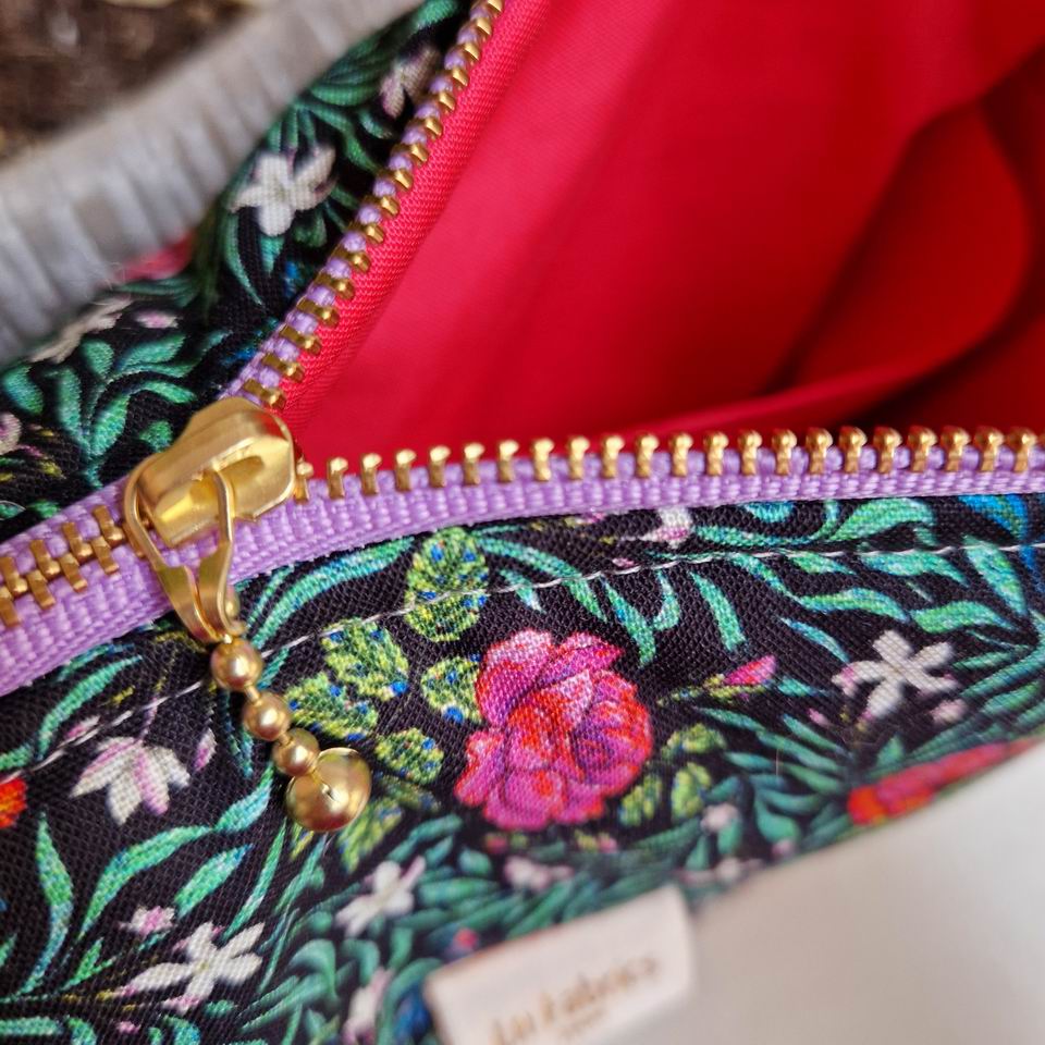 Trousse en tissu molletonné, imprimé floral, Le Langage des Fleurs Odile Bailloeul chez Free Spirit ; à l'intérieur, l'élégance d'une jolie matière naturelle, une doublure en coton couleur papaye de toute beauté.
