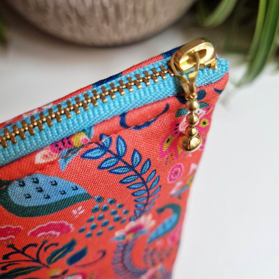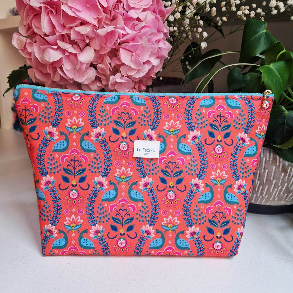 Trousse en tissu Dashwood Studio molletonné, imprimé feuillages et paons sur un fond oranger de la collection Indian Summer créée par Nina Ghataora ; à l'intérieur, l'élégance d'une jolie matière naturelle, une doublure en coton couleur vert prairie imprimé pois dorés métallisés de toute beauté.