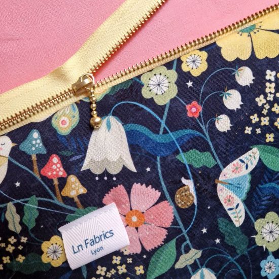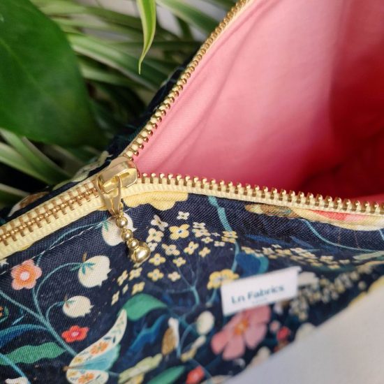 Trousse en tissu molletonné, imprimé floral Hedgerow de chez Dashwood Studio ; à l'intérieur, une doublure en coton rose pêche pour ajouter un peu de douceur et une certaine dose de gaité !